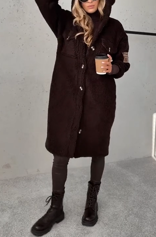 Γυναικείο ζεστό παλτό με κουκούλα και κουμπιά, πλεκτό και μακρυμάνικο γούνινο μπουφάν-GR