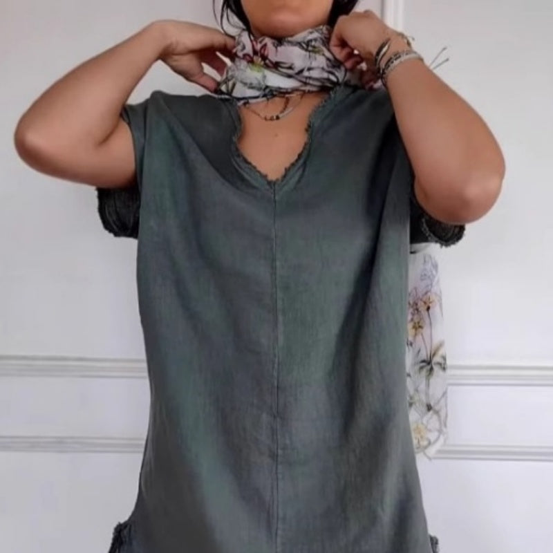 Į pakuotę įeina: Sudėtis: 1* Lininė medvilninė suknelė su V formos iškirpte ir kutais