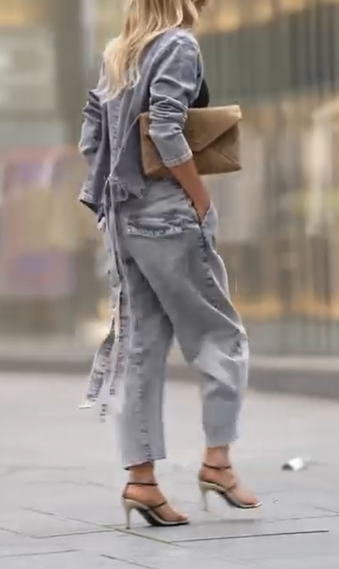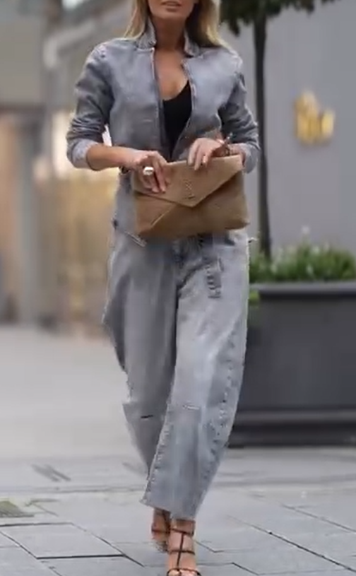 Το πάνω μέρος είναι ένα κοντό τζιν μπουφάν με όρθιο γιακά, δημιουργώντας μια κομψή, καθαρή εμφάνιση. Κατασκευασμένο από ανθεκτικό τζιν, προσφέρει μια κομψή, ανθεκτική υφή που διατηρεί το σχήμα του. Αυτό το μπουφάν είναι ευέλικτο και κατάλληλο για πολλές περιστάσεις. Για casual περιστάσεις, συνδυάστε το με ένα απλό μαύρο τοπ, όπως φαίνεται στην εικόνα, για μια casual αλλά κομψή εμφάνιση. Λειτουργεί επίσης καλά ως κομμάτι σε στρώσεις την άνοιξη και το φθινόπωρο, προσφέροντας ζεστασιά και προσθέτοντας μια πινελιά ρετρό και μοντέρνου στυλ.