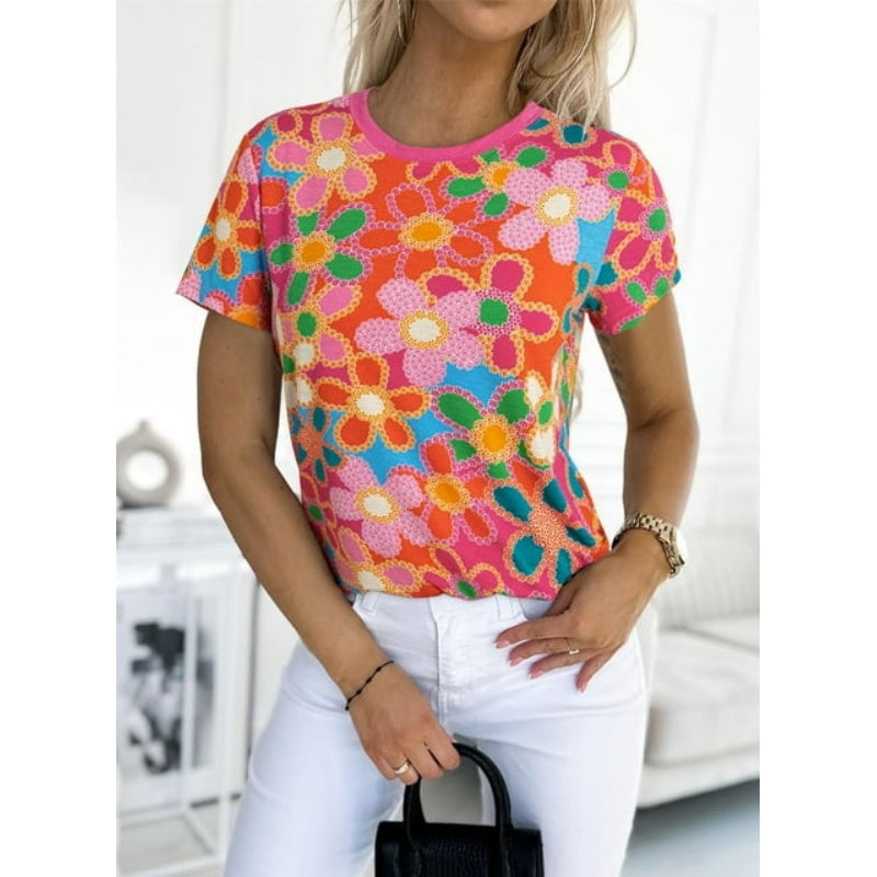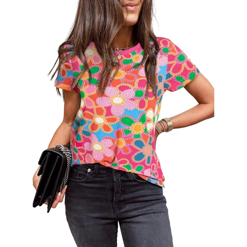 Αυτό το ροζ μπλουζάκι με φλοράλ στάμπα διαθέτει ένα όμορφο και έντονο φλοράλ μοτίβο, που προσθέτει μια θηλυκή και μοντέρνα πινελιά στην καθημερινή σας γκαρνταρόμπα. Ιδανικό για να αναβαθμίσετε το στυλ σας σε κάθε περίσταση.