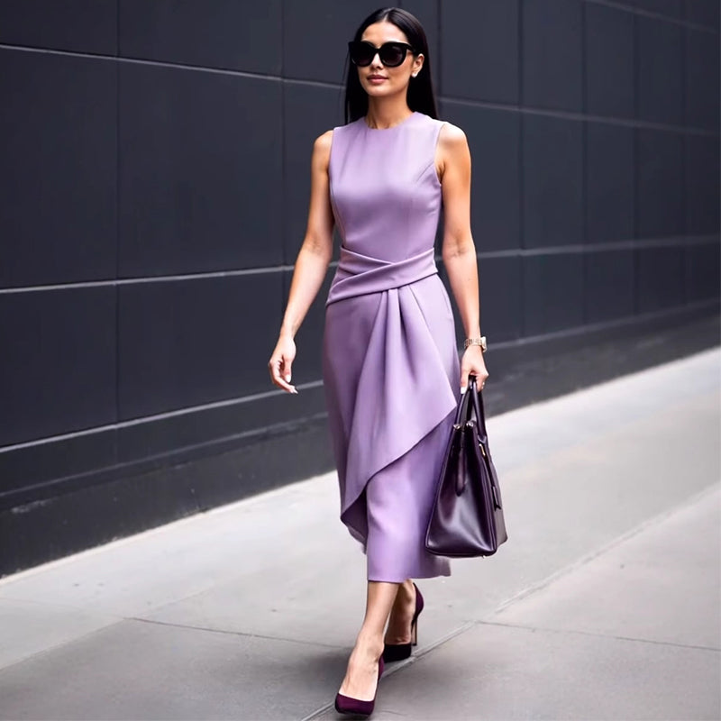 Κατασκευασμένο με στρατηγικές τεχνικές πτύχωσης, αυτό το αμάνικο κούρεμα εφαρμόζει φυσικά κοντά στο σώμα, διατηρώντας μια κομψή σιλουέτα. Το ασύμμετρο πτύχωμα δημιουργεί ένα οπτικό εφέ επιμήκυνσης, τονίζοντας διακριτικά τη μέση και τις καμπύλες των γοφών για σμιλεμένες γραμμές, ιδανικό τόσο για ημερήσιες δραστηριότητες όσο και για βραδινές συγκεντρώσεις.