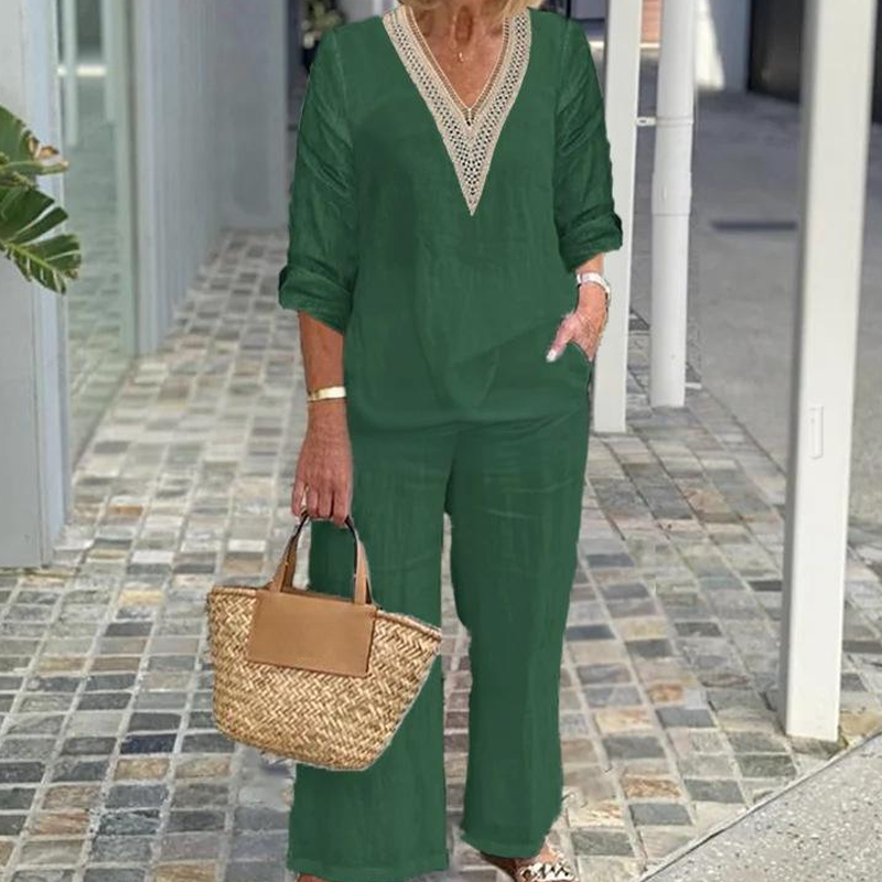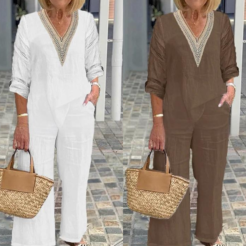 Το σετ περιλαμβάνει: 1* Γυναικείο τοπ με V λαιμόκοψη και φαρδύ παντελόνι